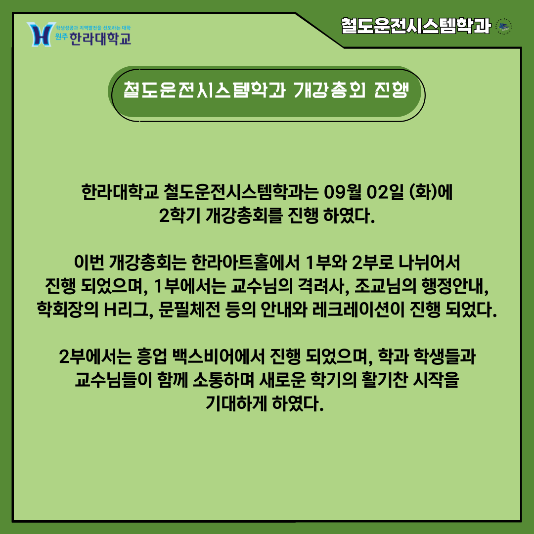 철도운전시스템학과는 09월 02일(화)에 25학년도 2학기 개강을 기념으로 개강 총회를 진행하였습니다!