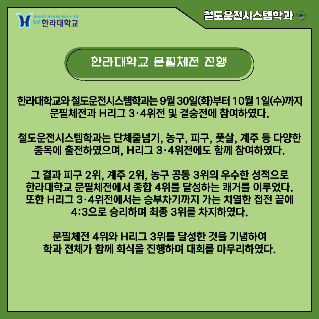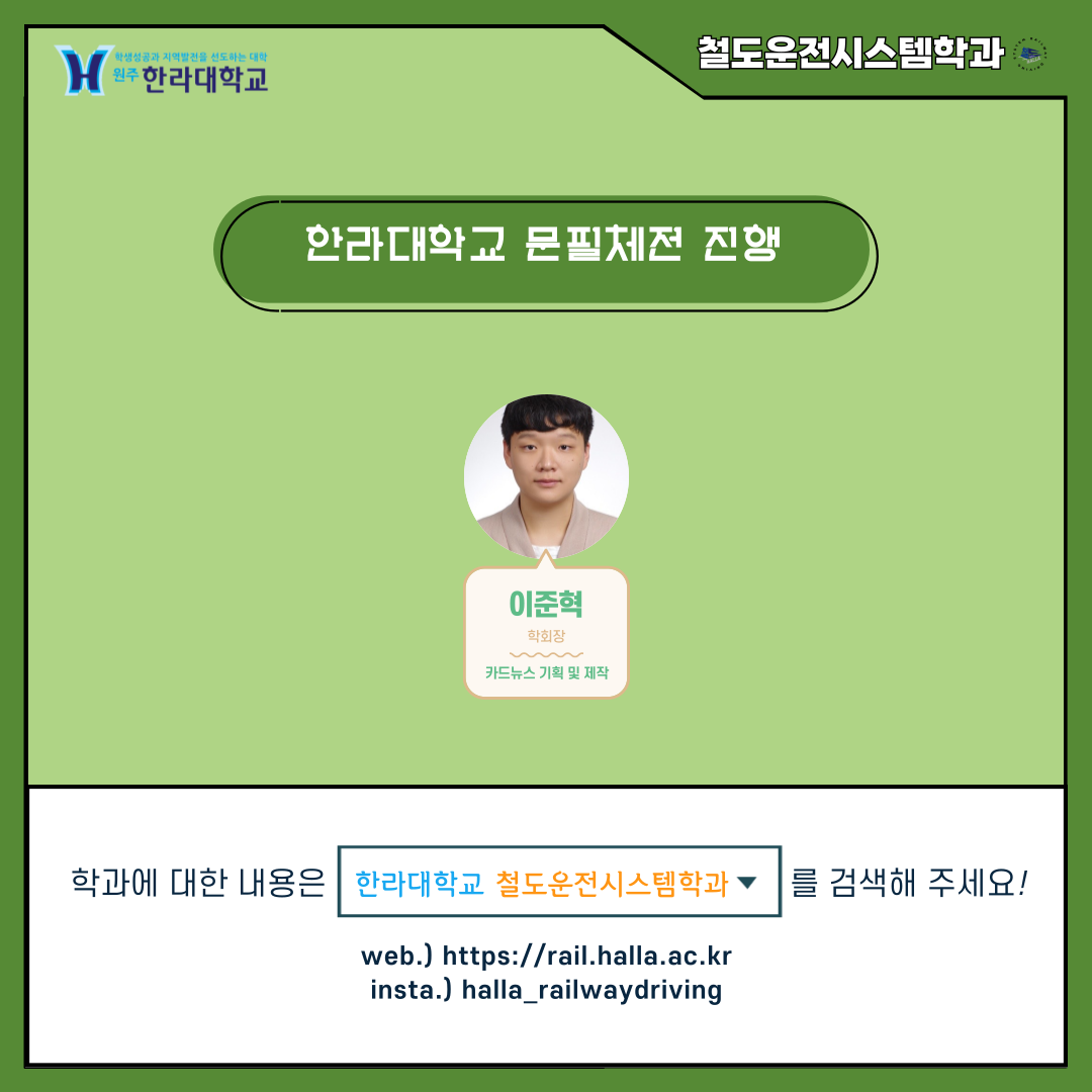 저희 철도운전시스템학과는 09월 30일(화)부터 10월 01일(수)까지 진행된 한라대학교 문필체전에 출전하였습니다~!